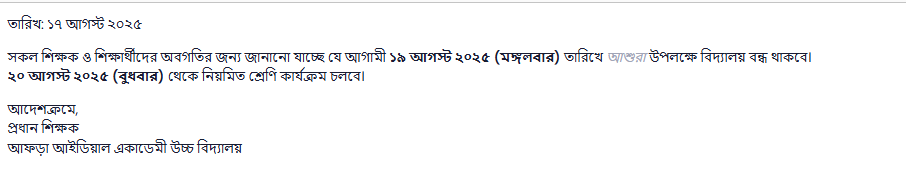 সকল শিক্ষক ও শিক্ষার্থীদের অবগতির জন্য জানানো যাচ্ছে যে আগামী ১৯ আগস্ট ২০২৫ (মঙ্গলবার) তারিখে আশুরা উপলক্ষে বিদ্যালয় বন্ধ থাকবে।