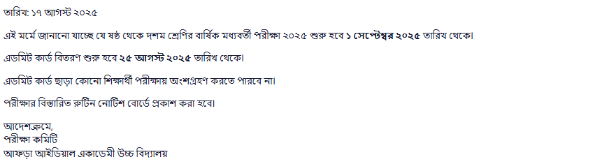 এই মর্মে জানানো যাচ্ছে যে ষষ্ঠ থেকে দশম শ্রেণির বার্ষিক মধ্যবর্তী পরীক্ষা ২০২৫ শুরু হবে ১ সেপ্টেম্বর ২০২৫ তারিখ থেকে।